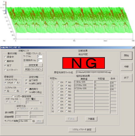 従来の官能検査を三菱エンジの音響振動診断システム「Visible Wave」や小野測器の「FFT」を用いることで、データ化自動検査へとシフト。トレーサビリティにも貢献。