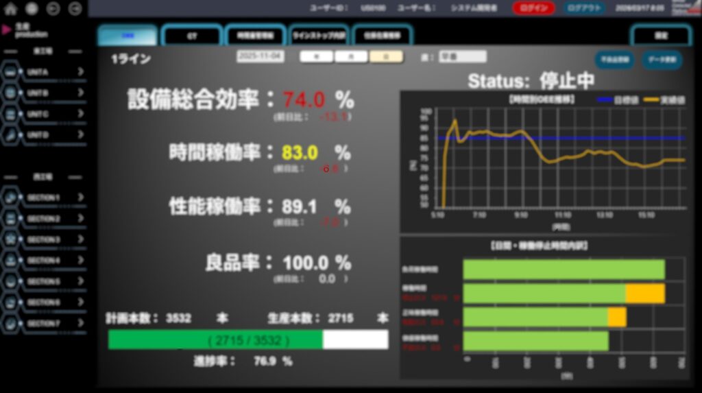 OEE(設備総合効率)・時間稼働率・性能稼働率・良品率を複数工場・複数ラインで横断管理。