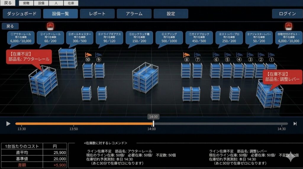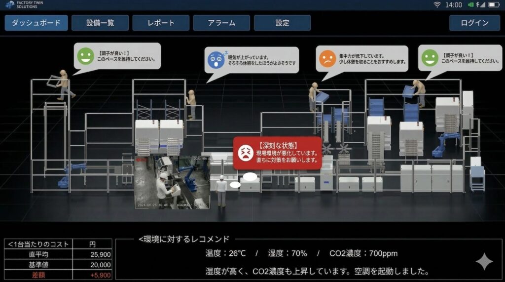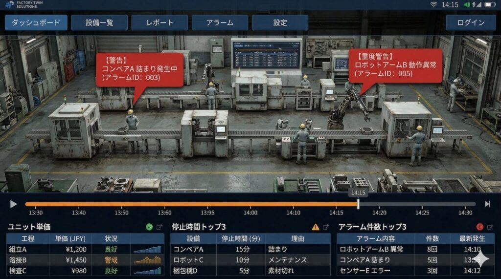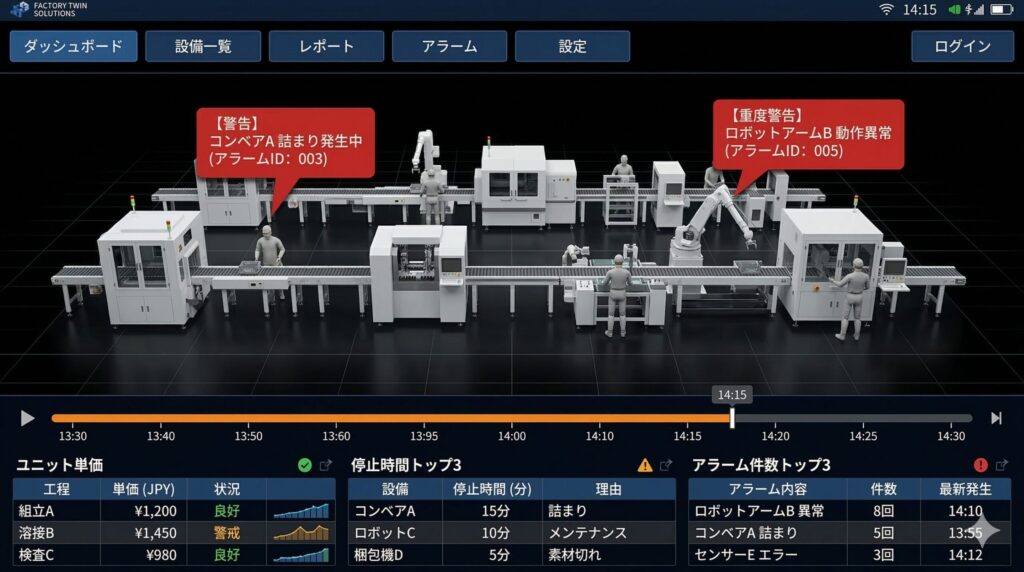 工場ラインの3Dモデルとリアルカメラ映像を連動させ、設備の稼働状況・アラート・在庫状況・作業者の状態をリアルタイムで一元管理します。