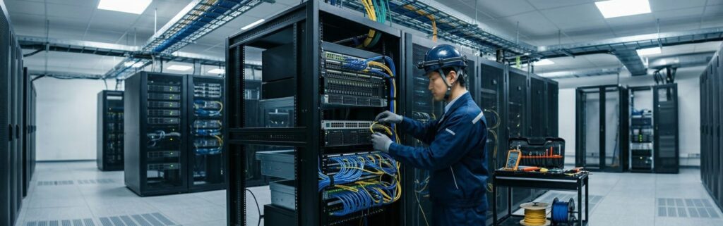 AIやFAの高度な制御を支えるのは、決して途切れない通信環境です。現場の過酷な条件下でも安定したデータ循環を確保するため、LAN工事から光ケーブル、Wi-Fi最適化まで、物理層から「情報の精度」を担保。現場の知能を最大化させるための、強固なインフラを実装します。